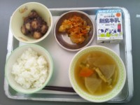 今日の献立は、ご飯、牛乳、のっぺい汁、鳥から揚げの野菜あんかけ、しらたまぜんざい...