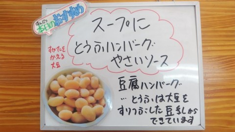 ・スープ煮・豆腐ハンバーグ野菜ソース・黒糖パン・牛乳