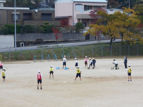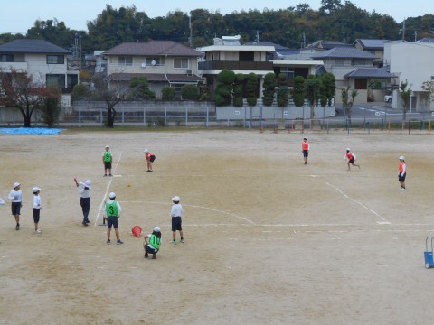 5年生 体育「ベースボール型ゲーム」の様子です。めあてをもって学習しています。