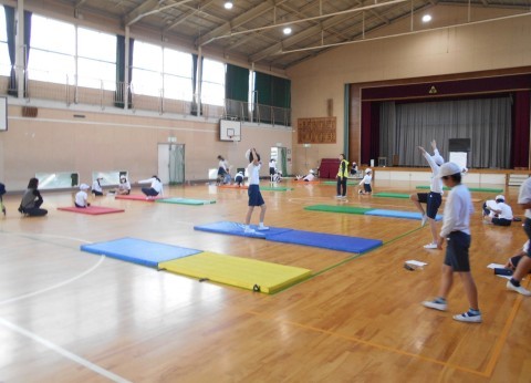 5年生 体育「マット運動」連続する技に挑戦です。