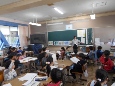 1年生 国語「たぬきの糸車」です。自分が好きな場面をえらんで伝え合う活動をしました。