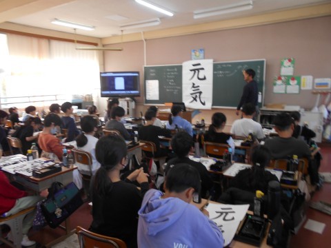 4年生 習字の授業の様子です。「はらい」に気を付けて,丁寧に書きます。