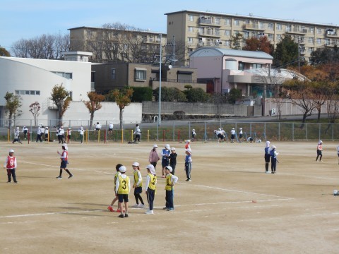 3年生 体育 「タグフットボール」のゲームです。すきまの突破についてチームで話し合って実践します。