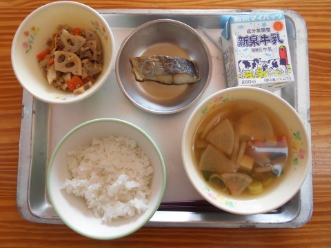 ・けんちん汁・鰆の柚庵焼き・レンコンのきんぴら・ごはん・牛乳