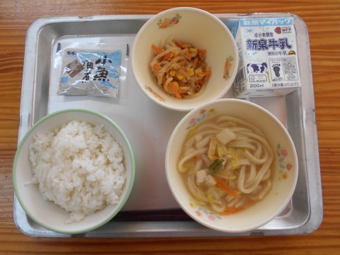 ・みそ煮込みうどん・だいこんの塩麹和え・小魚の佃煮・ごはん・牛乳