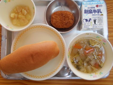 ・冬野菜スープ・コロッケ・とろりフルーツコンポート・コッペパン・牛乳