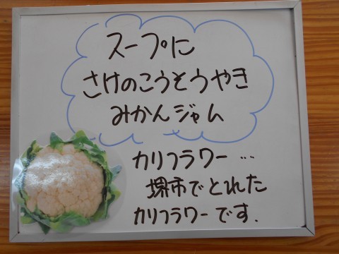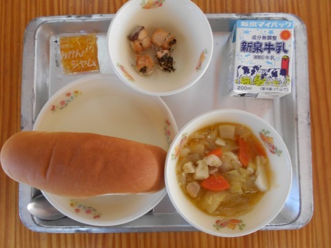 ・スープ煮・鮭の香草焼き・みかんジャム・コッペパン・牛乳