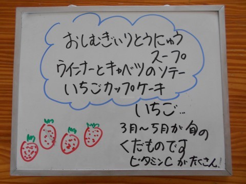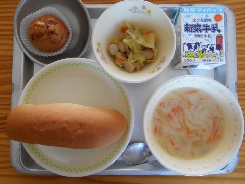 ・押し麦入り豆乳スープ・キャベツのソテー・いちご入りカップケーキ・ミニコッペパン・牛乳