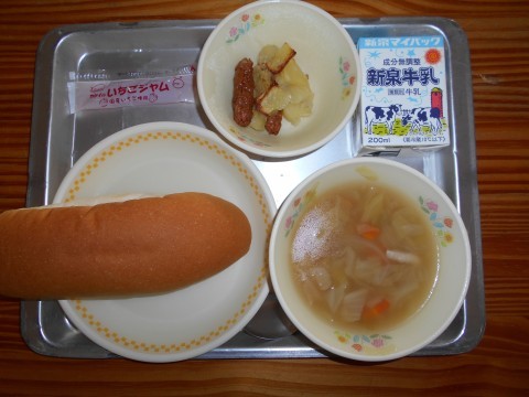・春野菜スープ・ウインナーポテト・コッペパン・いちごジャム・牛乳