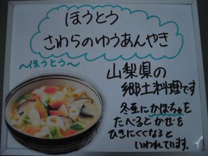 今日の大おかずは山梨県の郷土料理である、ほうとうです。
