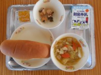 今日の給食は 牛乳 コッペパン きのこシチュー 和風サラダ サラダもシチューも美味しかったです!