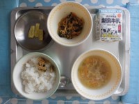 今日の給食は、・ごはん・卵スープ・ビビンバ風・さつまスティック でした。ビビンバ...