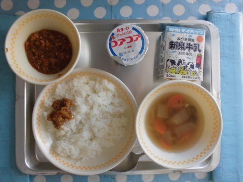 給食のドライカレーには、ひきわり大豆も使用していて、たんぱく質たっぷりです。