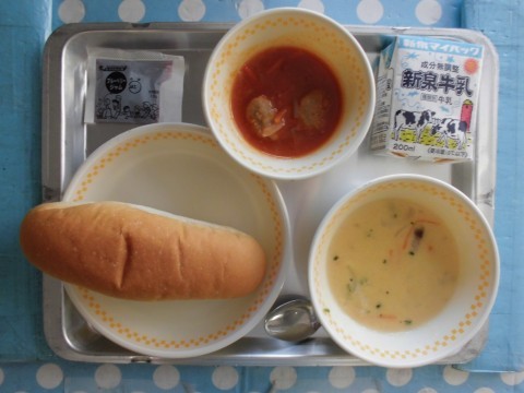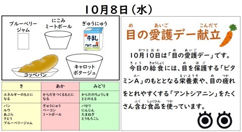給食では、目に優しい栄養素のビタミンAたっぷりのにんじんを使用したポタージュや、アントシアニンを豊富に含んだブルーベリージャムが登場しました!