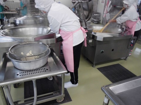 写真は、カレー豆腐をつくる釜の隣で豆腐の下茹でをしている様子です。