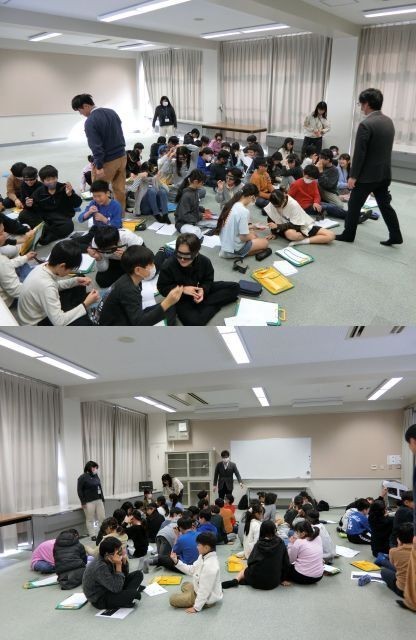 堺市視覚・聴覚障害者センター点字図書館から講師の方をお迎えして,みえ方にハンディがあるとはどういうことかを,工夫された器具を使って体験しながら学びました。