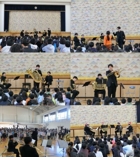 日本教育公務員弘済会大阪支部の助成事業として,ブラスアンサンブルGIFT(ギフト)の皆さん5名(関西で活動する金管楽器奏者のみなさん)の方々が来校し,フレッシュコンサートが行われました。体育館いっぱいにあたたかい音色が響き,はるみ小の校歌も演奏していただき,みんなで歌いました。アンコールはクリスマスソング,とても楽しいコンサートでした。