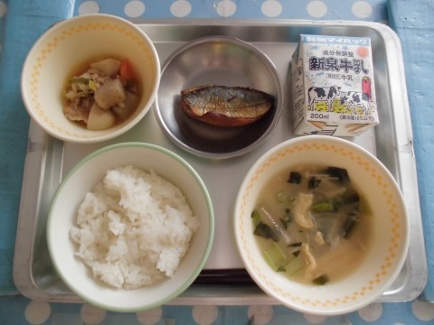 給食のいも煮には,里芋のほかに豚肉,にんじん,ねじりこんにゃく,白ねぎを入れて作りました。