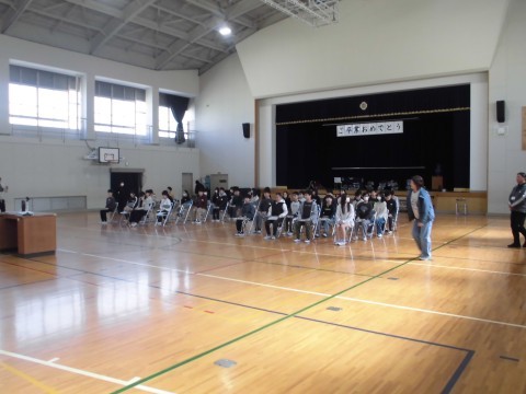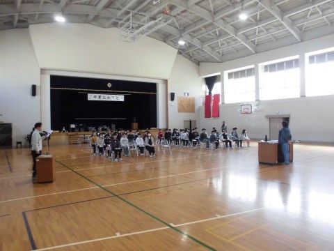 最後の卒業式練習の様子です♪卒業制作の「絵刻字(えこくじ)」を体育館に掲示しました♪
