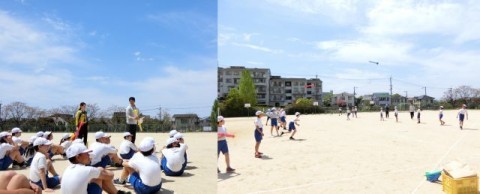今年度,学校群の取組として,晴美台中学校から体育の先生が週1回来校し,体育授業の指導に加わってくれます。今日は「投げる」動作の練習を行いました。