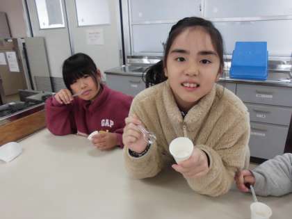 11月29日(金) 3年生 豆腐作り体験5 公開日 2024/12/01 更新日 2024/12/01 3年 最後にみんなで作った豆腐を試食しました♪ 「大豆の味がする!」「おいしい!」と完食する児童もいれば、「この味ちょっと苦手…」という児童も! 「しょうゆがほしい〜!!」という声もありました^^ とても楽しい体験になりましたね♪