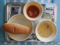 今日の給食は、・コッペパン・牛乳・キャロットポタージュ・煮込みミートボール・ブル...