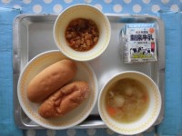 今日の給食は、・ミニパン・揚げパン・牛乳・うずら卵入り野菜スープ・チリコンカン ...
