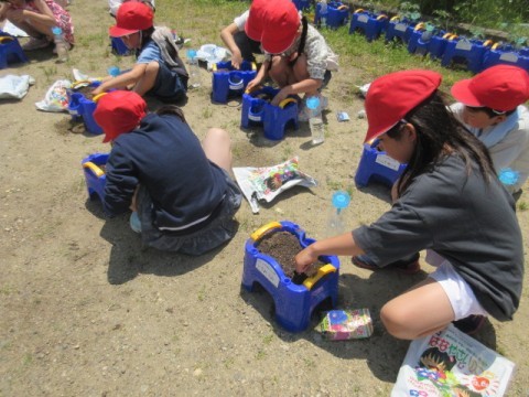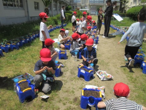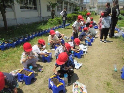 生活科で「あさがお」を植木鉢に植えていました。これから芽が出て、きれいな花が咲くまで、しっかりと観察し世話をしていきます。「あさがお」のつるを使ってリース作りもする予定です。