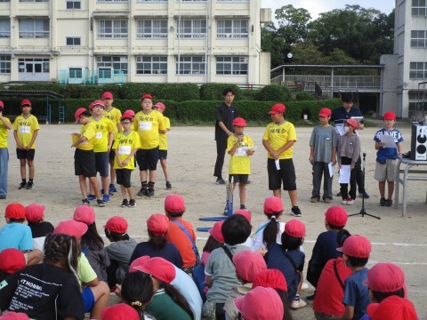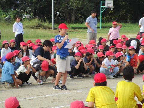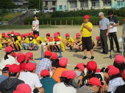連合運動会 壮行会④ 公開日 2025/10/06 更新日 2025/10/06 学校からのお知らせ 綱引きは実演できませんでしたが、どのような競技なのか説明できました。代表として5年生の児童が激励の言葉をおくりました。その後、6年生代表が決意の言葉をおくりました。