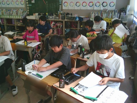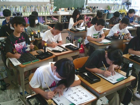 1組は習字の学習です。