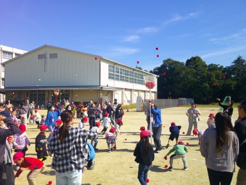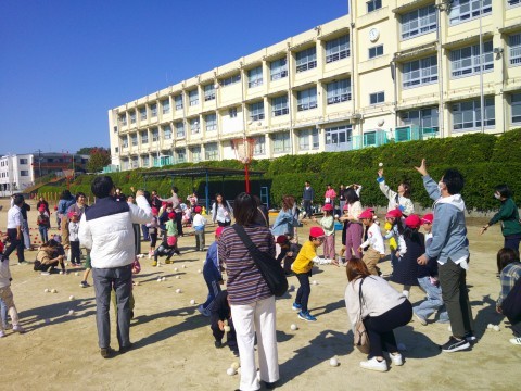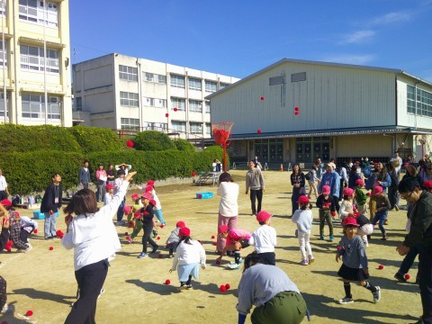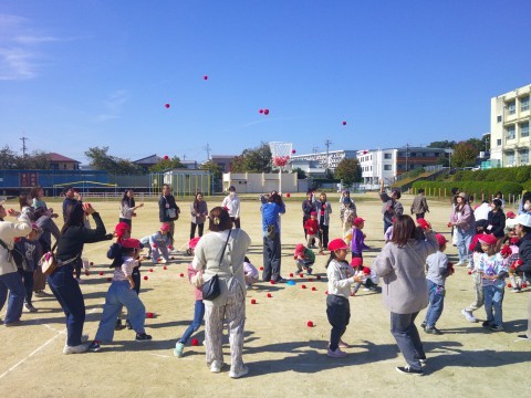 クラスに分かれて親子で玉入れを楽しんだ後は、みんなでじゃんけん列車をしました。