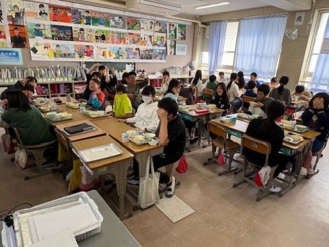 待ちに待った給食の時間です。みんなよく食べています。