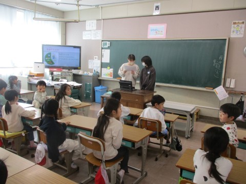 今日は、総合的な学習の時間に1年生への授業をしに行きました。食品ロスについて調べている5年生の、学校グループの子たちで「学校の食品ロスを減らしたい」という思いで1年生への啓発をしました。1日に残されている給食と同じ重さの模型を持ってもらい、苦手なものでも頑張って食べてほしいという願いを込めて伝えていました。