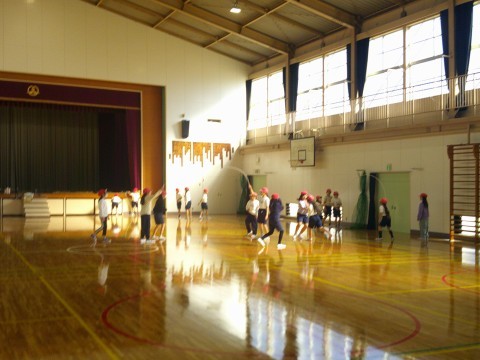 工事が終わって、床や壁が新しくなった体育館で、少しずつ体育や学級活動を始めています。