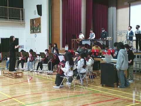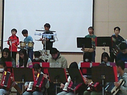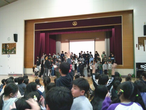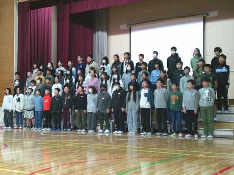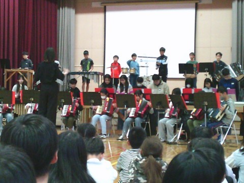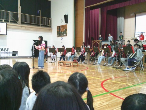 6年生から,お返しで合奏と合唱を披露し,