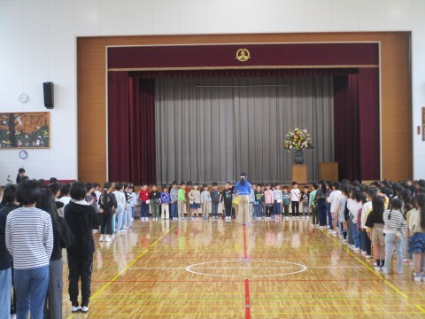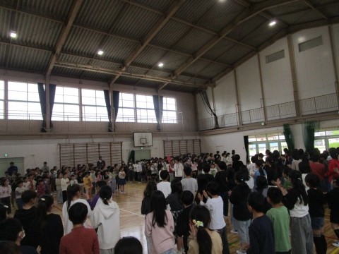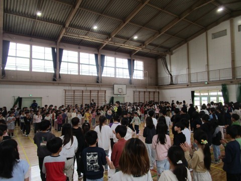対面式での様子です。温かい拍手で迎えた2年~6年生,笑顔で入ってきた1年生,とても気持ちのよい対面式でした。1年生に向けて,代表の児童の挨拶と,2年~6年生たちによる校歌がおくられました。