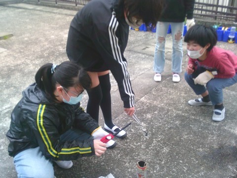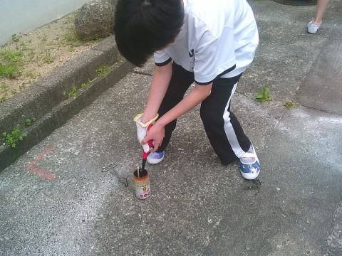 昇降口の横辺りから,何やら燃えているにおいがしていました。「火事か!?」と思って見に行くと,6年生が実験をしていました。缶に穴があいているものと,あいていないもの。どちらがよく燃えたのでしょうか。