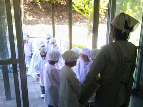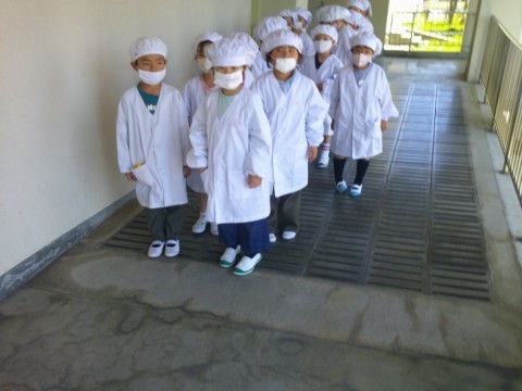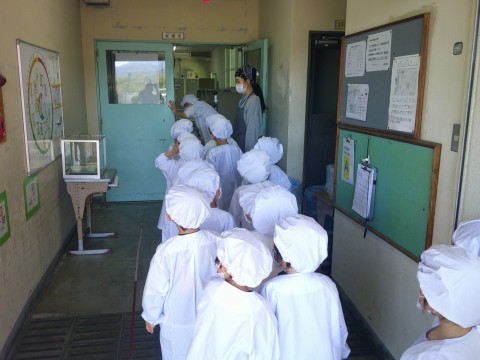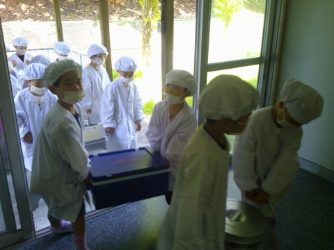 みんなで静かに並んで、挨拶をして給食場に入り食管を受け取ります。