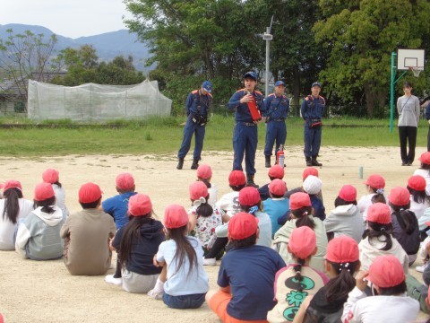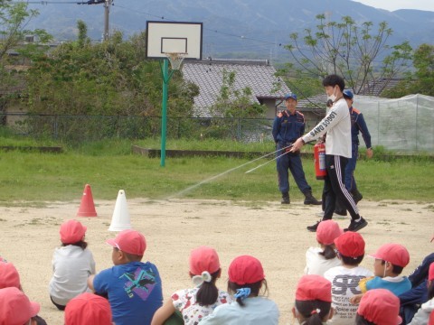 本日の避難訓練には,消防署の方々にお越しいただき,消火器の使い方を説明していただきました。