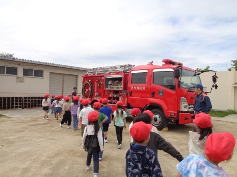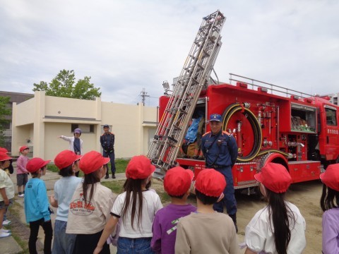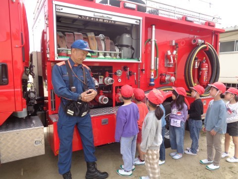 園でも見たことがあると言っている子もいましたが,実際にはしごを消防隊員の方が動かすと,「重そう!」や「大きい!」と感嘆の声が漏れていました。