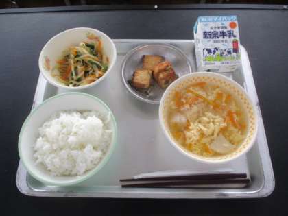 むらくも汁、もやしとにらの炒め煮、厚揚げの生姜焼