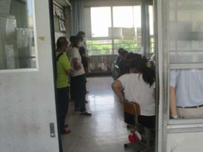 中学校の先生たちが、小学校の給食のようすについて、見に来ています。
