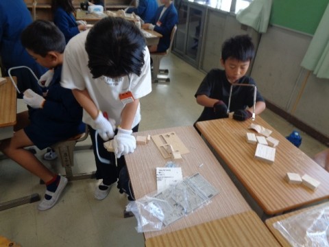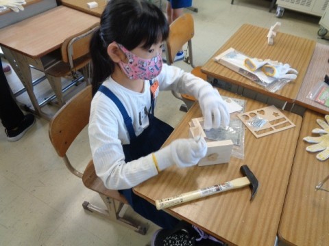 のこぎりや金づちを操作して工作します。上手に道具を使うことができたかな。