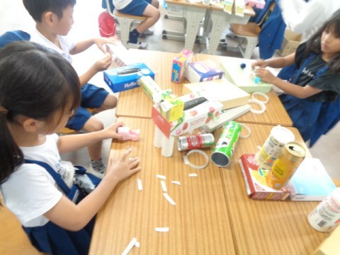 お菓子の空き箱や飲料水のペットボトルキャップなどを活用しました。