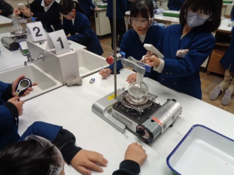 ガスコンロの火加減を確かめながら温度を計り、変化の様子をじっくり観察していました。