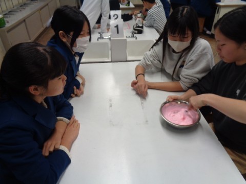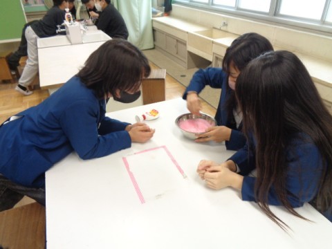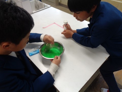 “お楽しみ実験”に取り組みました。今日の材料は、木工用ボンド、洗濯のり、食紅。身近なものばかりですが、組み合わせてみると、子どもたちの目が輝くような不思議な変化が起こります。ボンドと洗濯のりを混ぜ合わせると、ゆっくりと手ごたえが変わり、「なんか固まってきた!」「これ、スライムみたいになってきた!」とあちこちから歓声があがりました。