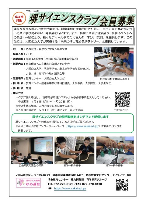 「堺サイエンスクラブ」会員募集!(6年生)