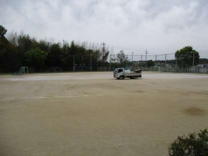 運動会にむけて、運動場の表面を安定させるために。「にがりまき」をしていただきました。砂埃がまうのを抑える効果があります!!