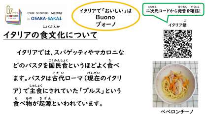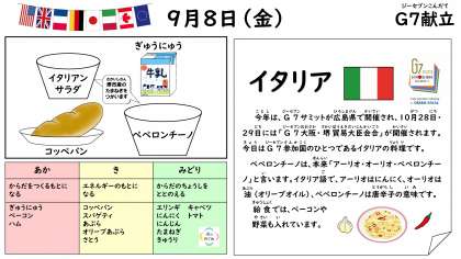9月8日(金)の給食 G7特別メニュー(イタリア版) 公開日 2023/09/11 更新日 2023/09/11 活動の様子 10月に堺市で「G7大阪・堺貿易大臣会合」が開かれることによる、G7特別メニューです。今日はイタリアの料理でした。少しピリ辛ですが、子どもたちは喜んで食べていました。
