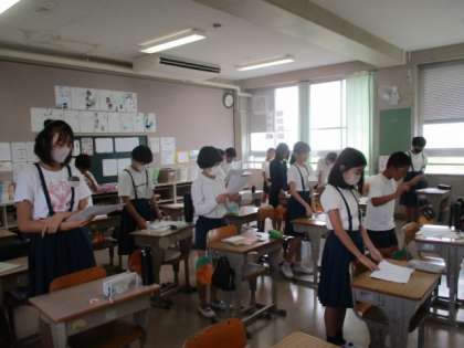 6年1組 群読に挑戦! 公開日 2023/09/12 更新日 2023/09/12 活動の様子 迫力のある声が聞こえてきました。6年生が取り組んでいる「群読」の練習の声でした!4グループに分かれて、それぞれのパートを一生懸命音読していました。とっても迫力がありました!